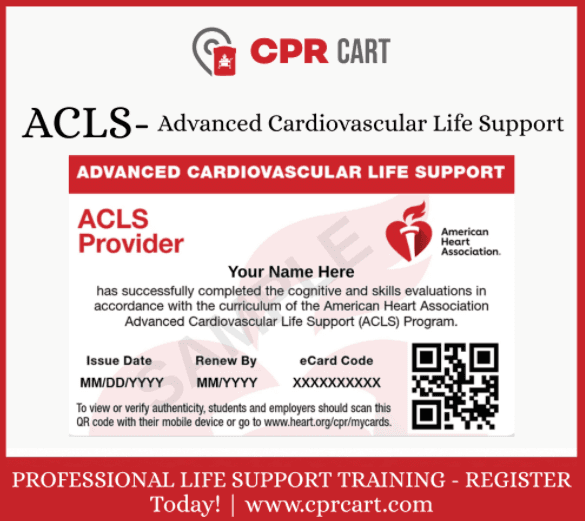 The ACLS Certification course at CPR Cart is designed for healthcare professionals who manage cardiac emergencies and critical patient care. The program follows standards from the American Heart Association and uses a flexible hybrid format with online learning and a short hands-on skills session. After completion, students receive a nationally recognized ACLS Provider eCard.